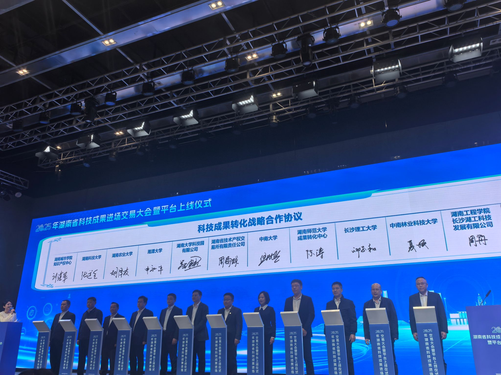 本网讯(通讯员徐智超)2025年11月28日,由湖南省科学技术厅主办的2025年湖南省科技成果进场交易大会暨平台上线仪式在长沙隆重举行。湖南城市学院副校长徐姝教授、知识产权中心刘湛军博士及韩鑫桦老师受邀代表学校出席大会,并参与高校院所合作单位签约仪式,以实际行动推动学校科技成果高效转化、促进校企深度合作、服务区域创新发展。