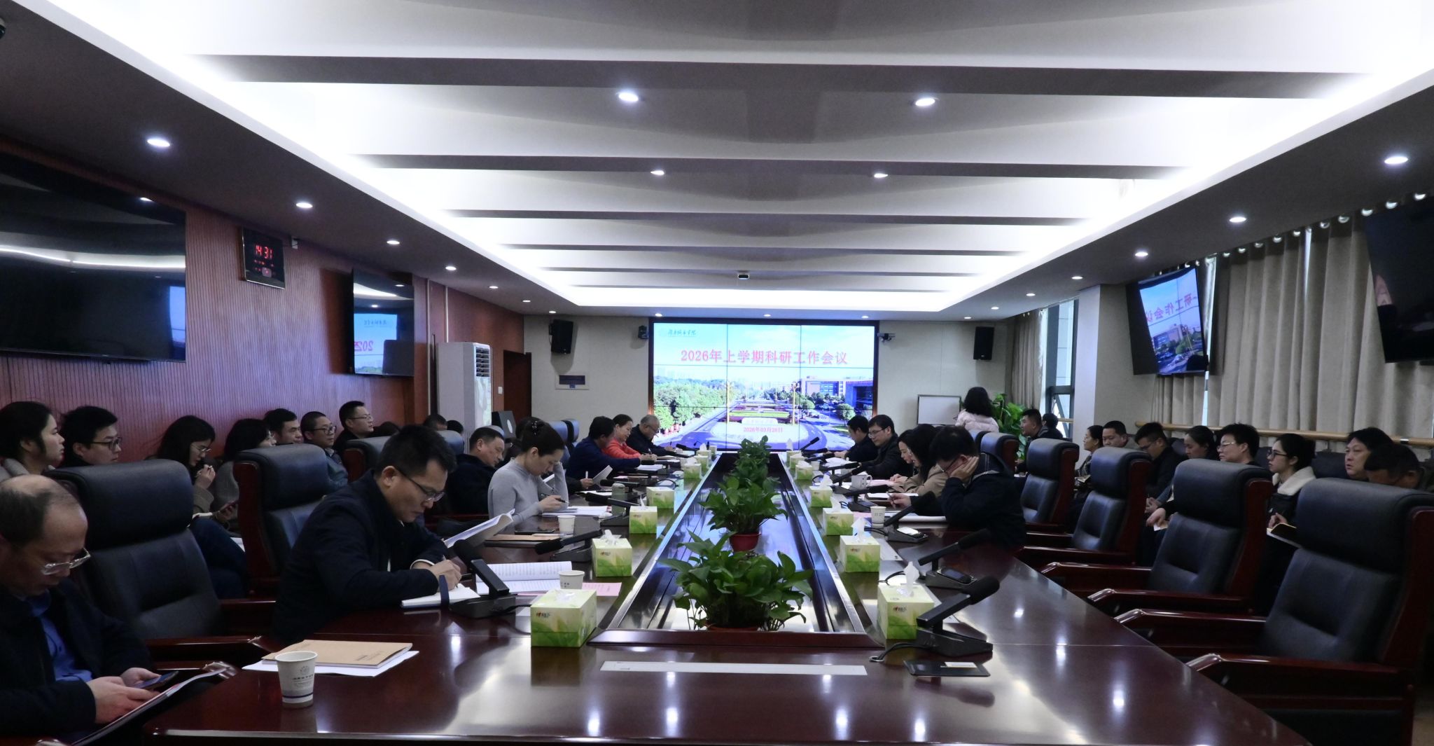 春潮涌动千帆竞,砥砺深耕正当时。3月26日,我校2026年上学期科研工作例会在一办公楼一会议室召开。校长陈瑜出席会议并讲话,副校长徐姝主持,各二级单位主要负责人、分管科研工作负责人及科研处全体工作人员参加会议。
